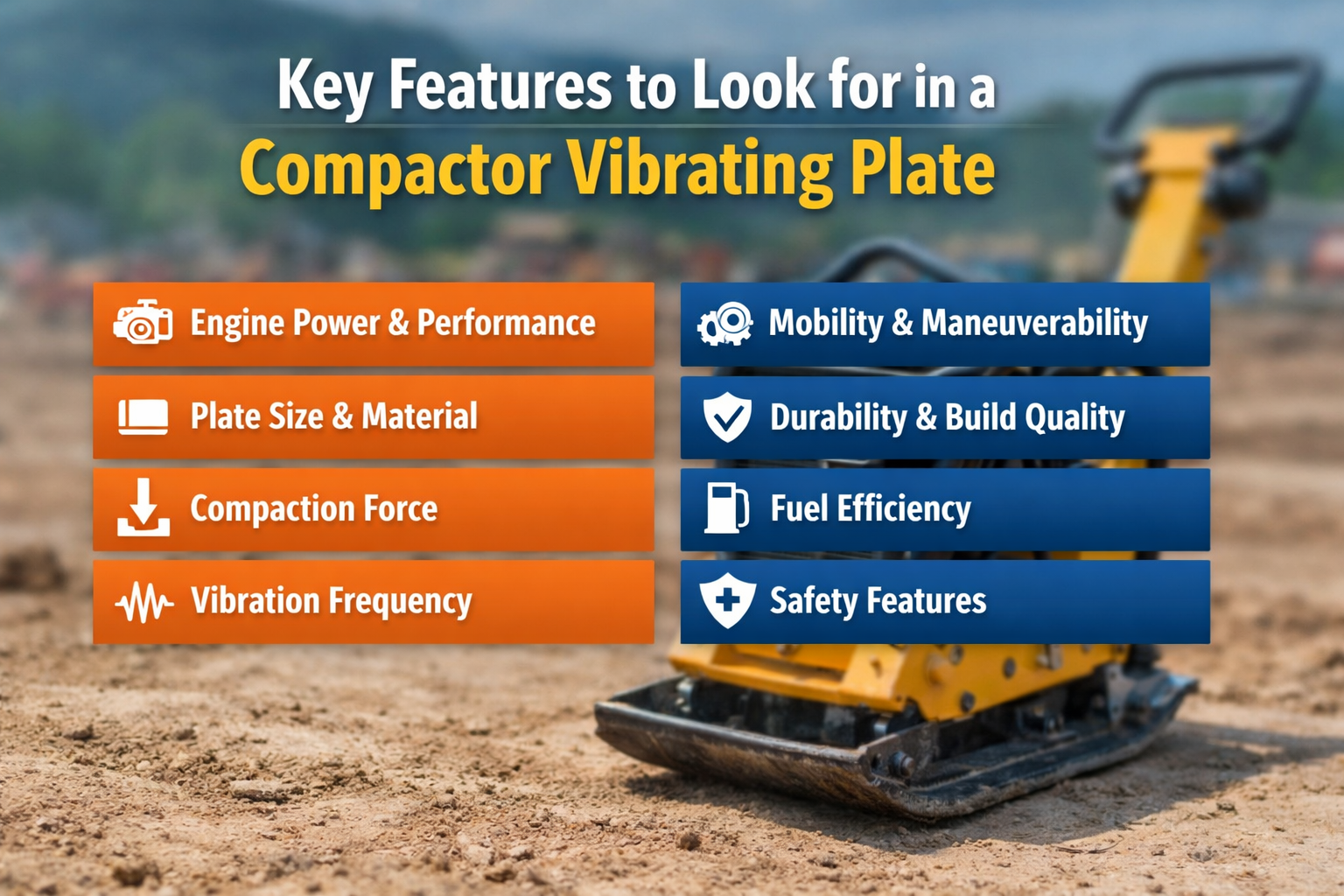Selecting the right compactor vibrating plate requires careful evaluation of several features, including engine power, plate size, compaction force, and durability. By understanding these key aspects, you can choose a machine that meets your specific needs and delivers efficient, high-quality results. Investing in the right equipment not only improves productivity but also ensures long-term reliability and cost-effectiveness in your construction projects.