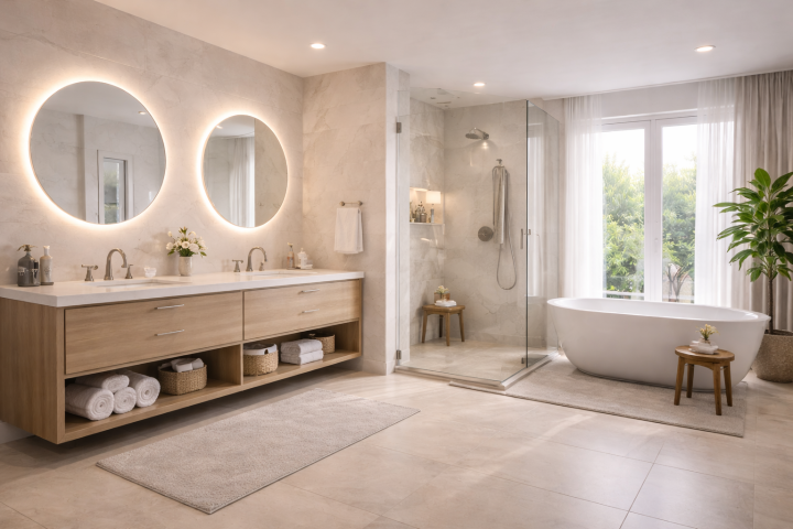 Our modular kitchen solutions include personalized layouts like L-shaped, U-shaped, island and parallel kitchens, paired with premium materials, smooth finishes and intelligent storage designs. For bathroom renovations, we create contemporary, spa-like environments featuring stylish fixtures, elegant tiles, efficient plumbing and innovative storage solutions. From design consultation and 3D planning to sourcing materials and executing installation, everything is managed professionally by our skilled team. We ensure that each project aligns with the homeowner's taste, budget and lifestyle.