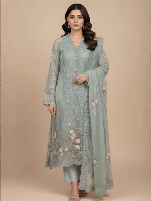 Pakistani dresses often feature luxurious fabrics such as chiffon, silk, lawn, georgette, and organza, chosen for both comfort and graceful draping.
