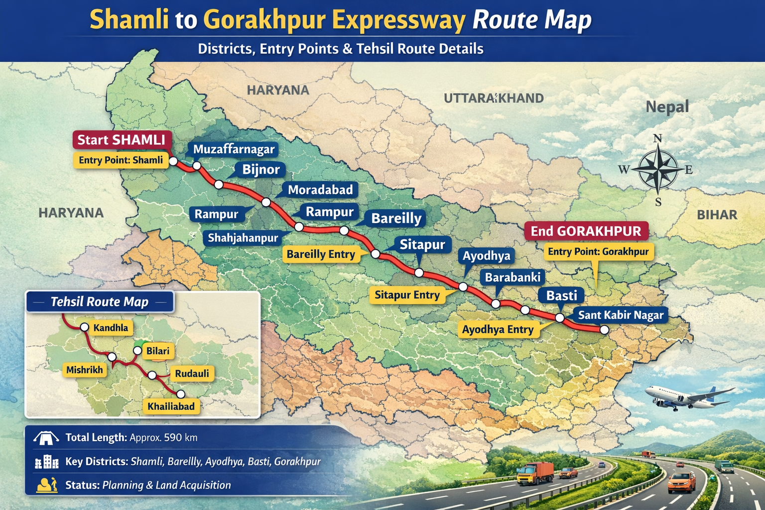 According to preliminary plans, it may pass through districts such as Shamli, Muzaffarnagar, Bareilly, Sitapur, Ayodhya, Basti, and Gorakhpur.