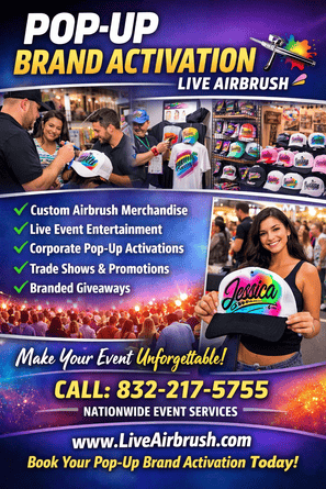 Looking to create unforgettable experiences for your audience? Live Airbrush offers creative Pop-up Brand Activation services designed to attract attention and boost engagement. Our professional airbrush artists provide custom merchandise, live art, and interactive experiences that leave a lasting impression at corporate events, trade shows, retail promotions, and marketing campaigns.